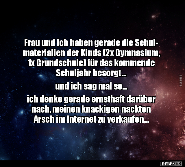 Frau und ich haben gerade die Schul- materialien der Kinds (2x Gymnasium, 1x Grundschule) für das kommende Schuljahr besorgt... und ich sag mal so... ich denke gerade ernsthaft darüber nach, meinen knackigen nackten Arsch im Internet zu verkaufen...