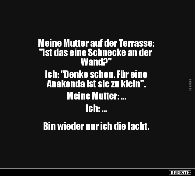 Meine Mutter auf der Terrasse: "Ist das eine Schnecke an der Wand?" Ich: "Denke schon. Für eine Anakonda ist sie zu klein". Meine Mutter: … Ich: … Bin wieder nur ich die lacht.