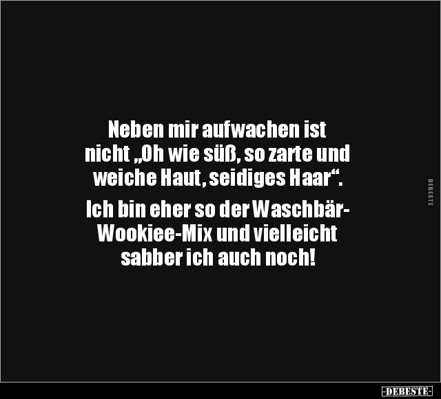 Neben mir aufwachen ist nicht „Oh wie süß, so zarte und weiche Haut, seidiges Haar“. Ich bin eher so der Waschbär- Wookiee-Mix und vielleicht sabber ich auch noch!
