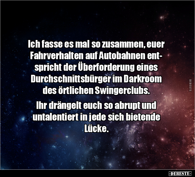Ich fasse es mal so zusammen, euer Fahrverhalten auf Autobahnen ent- spricht der Überforderung eines Durchschnittsbürger im Darkroom des örtlichen Swingerclubs. Ihr drängelt euch so abrupt und untalentiert in jede sich bietende Lücke.