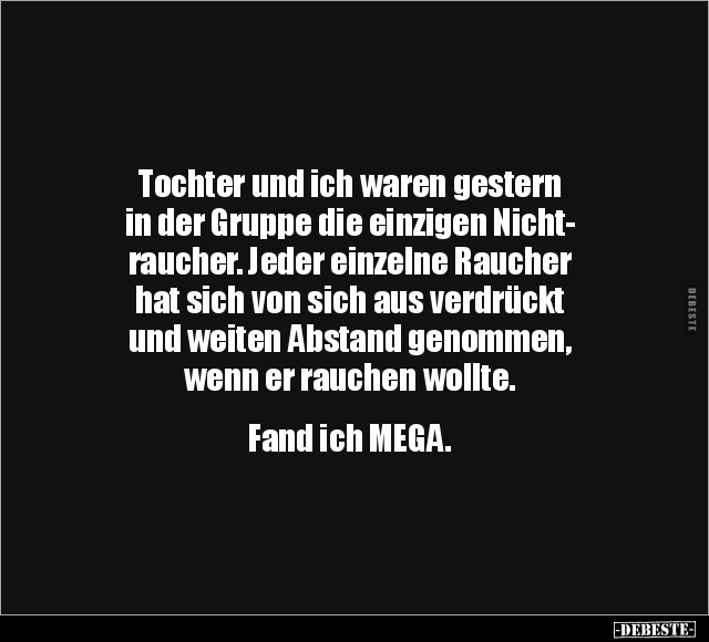 Tochter und ich waren gestern in der Gruppe die einzigen Nicht- raucher. Jeder einzelne Raucher hat sich von sich aus verdrückt und weiten Abstand genommen, wenn er rauchen wollte. Fand ich MEGA.