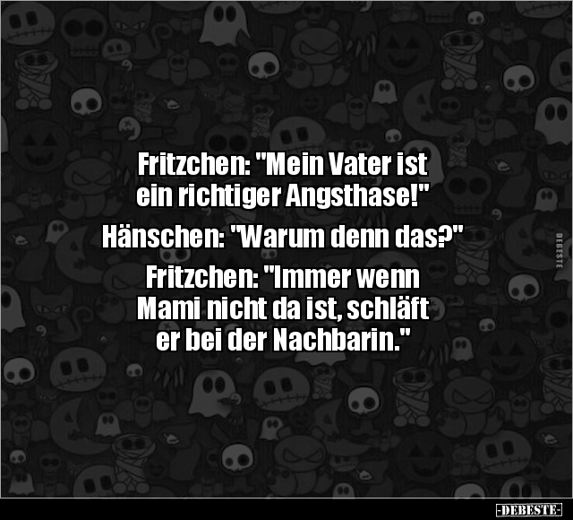 Fritzchen: "Mein Vater ist ein richtiger Angsthase!" Hänschen: "Warum denn das?" Fritzchen: "Immer wenn Mami nicht da ist, schläft er bei der Nachbarin."
