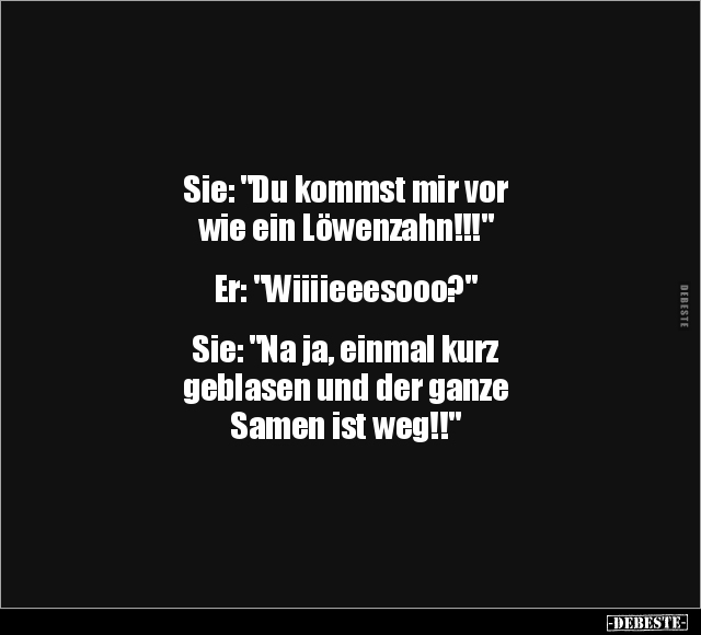 Sie: "Du kommst mir vor wie ein Löwenzahn!!!" Er: "Wiiiieeesooo?" Sie: "Na ja, einmal kurz geblasen und der ganze Samen ist weg!!"