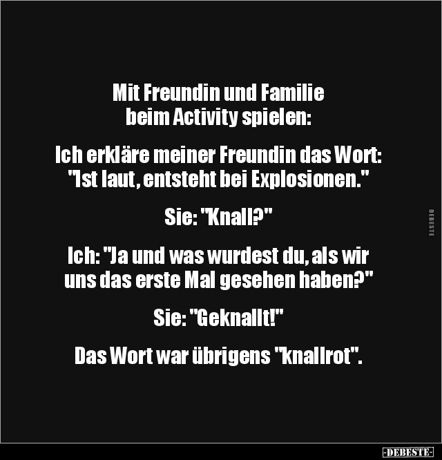 Mit Freundin und Familie beim Activity spielen: Ich erkläre meiner Freundin das Wort: "Ist laut, entsteht bei Explosionen." Sie: "Knall?" Ich: "Ja und was wurdest du, als wir uns das erste Mal gesehen haben?" Sie: "Geknallt!" Das Wort war übrigens "knallrot".