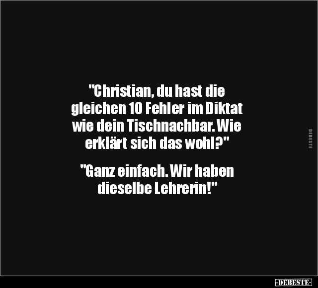 "Christian, du hast die gleichen 10 Fehler im Diktat wie dein Tischnachbar. Wie erklärt sich das wohl?" "Ganz einfach. Wir haben dieselbe Lehrerin!"