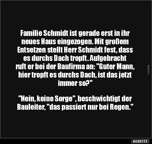 Familie Schmidt ist gerade erst in ihr neues Haus eingezogen. Mit großem Entsetzen stellt Herr Schmidt fest, dass es durchs Dach tropft. Aufgebracht ruft er bei der Baufirma an: "Guter Mann, hier tropft es durchs Dach, ist das jetzt immer so?" "Nein, keine Sorge", beschwichtigt der Bauleiter, "das passiert nur bei Regen."