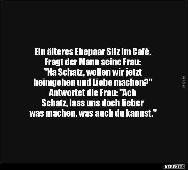 Ein älteres Ehepaar Sitz im Café. Fragt der Mann seine Frau: "Na Schatz, wollen wir jetzt heimgehen und Liebe machen?" Antwortet die Frau: "Ach Schatz, lass uns doch lieber was machen, was auch du kannst."
