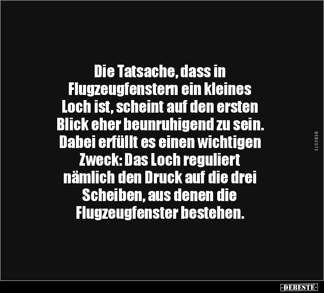 Die Tatsache, dass in Flugzeugfenstern ein kleines Loch ist, scheint auf den ersten Blick eher beunruhigend zu sein. Dabei erfüllt es einen wichtigen Zweck: Das Loch reguliert nämlich den Druck auf die drei Scheiben, aus denen die Flugzeugfenster bestehen.
