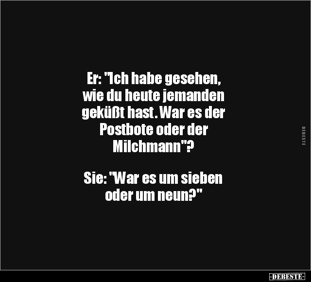 Er: "Ich habe gesehen, wie du heute jemanden geküßt hast. War es der Postbote oder der Milchmann"? Sie: "War es um sieben oder um neun?"