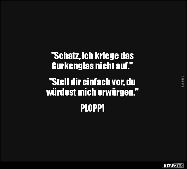 "Schatz, ich kriege das Gurkenglas nicht auf." "Stell dir einfach vor, du würdest mich erwürgen.” PLOPP!