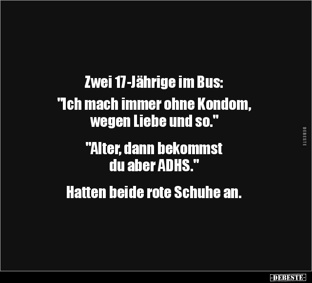 Zwei 17-Jährige im Bus: "Ich mach immer ohne Kondom, wegen Liebe und so." "Alter, dann bekommst du aber ADHS." Hatten beide rote Schuhe an.
