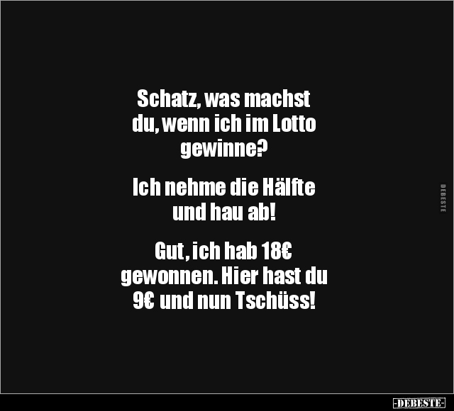 Schatz, was machst du, wenn ich im Lotto gewinne? Ich nehme die Hälfte und hau ab! Gut, ich hab 18€ gewonnen. Hier hast du 9€ und nun Tschüss!