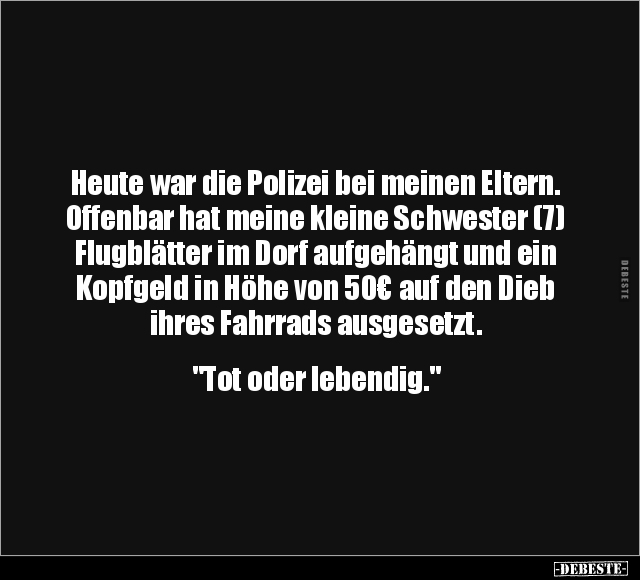 Heute war die Polizei bei meinen Eltern. Offenbar hat meine kleine Schwester (7) Flugblätter im Dorf aufgehängt und ein Kopfgeld in Höhe von 50€ auf den Dieb ihres Fahrrads ausgesetzt. "Tot oder lebendig."