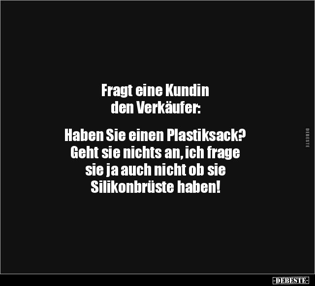 Fragt eine Kundin den Verkäufer: Haben Sie einen Plastiksack? Geht sie nichts an, ich frage sie ja auch nicht ob sie Silikonbrüste haben!