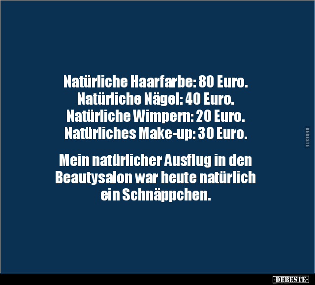 Natürliche Haarfarbe: 80 Euro. Natürliche Nägel: 40 Euro. Natürliche Wimpern: 20 Euro. Natürliches Make-up: 30 Euro. Mein natürlicher Ausflug in den Beautysalon war heute natürlich ein Schnäppchen.