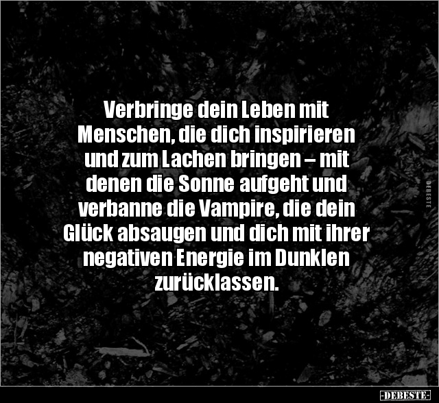 Verbringe dein Leben mit Menschen, die dich inspirieren und zum Lachen bringen – mit denen die Sonne aufgeht und verbanne die Vampire, die dein Glück absaugen und dich mit ihrer negativen Energie im Dunklen zurücklassen.