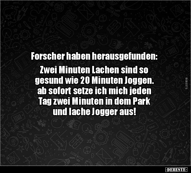 Forscher haben herausgefunden: Zwei Minuten Lachen sind so gesund wie 20 Minuten Joggen. ab sofort setze ich mich jeden Tag zwei Minuten in dem Park und lache Jogger aus!