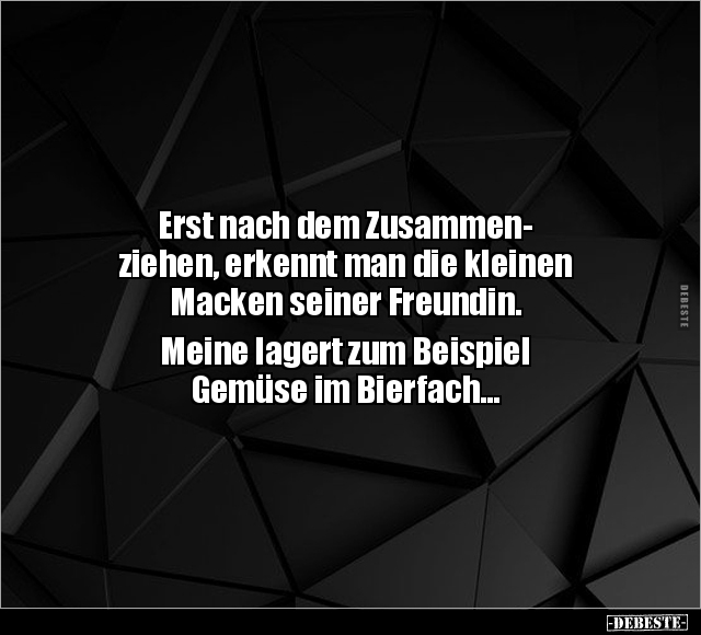 Erst nach dem Zusammen- ziehen, erkennt man die kleinen Macken seiner Freundin. Meine lagert zum Beispiel Gemüse im Bierfach...