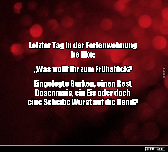 Letzter Tag in der Ferienwohnung be like: „Was wollt ihr zum Frühstück? Eingelegte Gurken, einen Rest Dosenmais, ein Eis oder doch eine Scheibe Wurst auf die Hand?