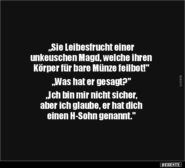 „Sie Leibesfrucht einer unkeuschen Magd, welche ihren Körper für bare Münze feilbot!" „Was hat er gesagt?" „Ich bin mir nicht sicher, aber ich glaube, er hat dich einen H-Sohn genannt."