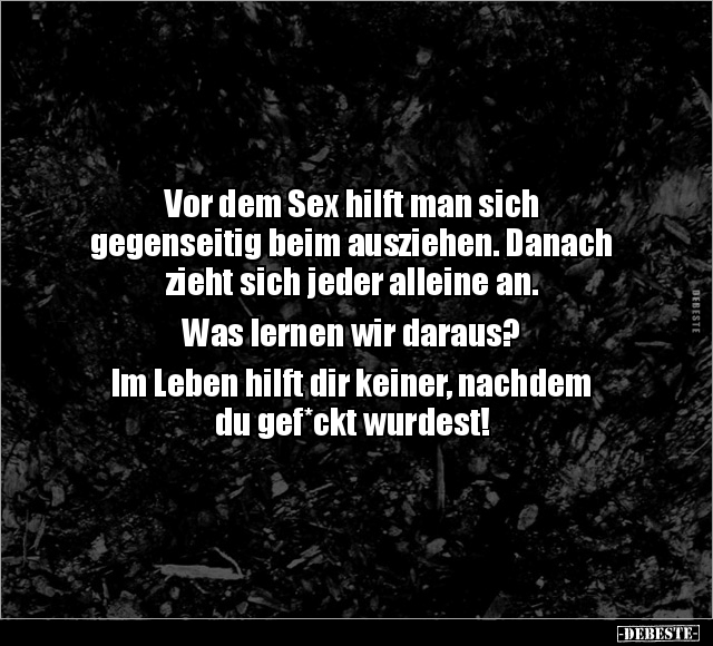 Vor dem Sex hilft man sich gegenseitig beim ausziehen. Danach zieht sich jeder alleine an. Was lernen wir daraus? Im Leben hilft dir keiner, nachdem du gef*ckt wurdest!
