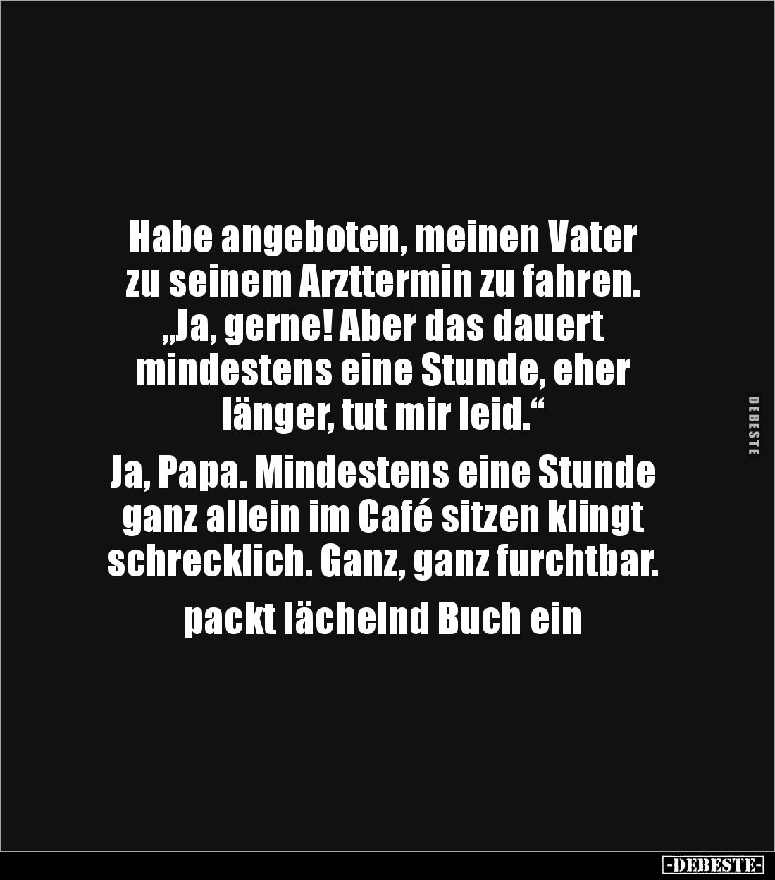 Habe angeboten, meinen Vater zu seinem Arzttermin zu fahren. „Ja, gerne! Aber das dauert mindestens eine Stunde, eher länger, tut mir leid.“ Ja, Papa. Mindestens eine Stunde ganz allein im Café sitzen klingt schrecklich. Ganz, ganz furchtbar. packt lächelnd Buch ein