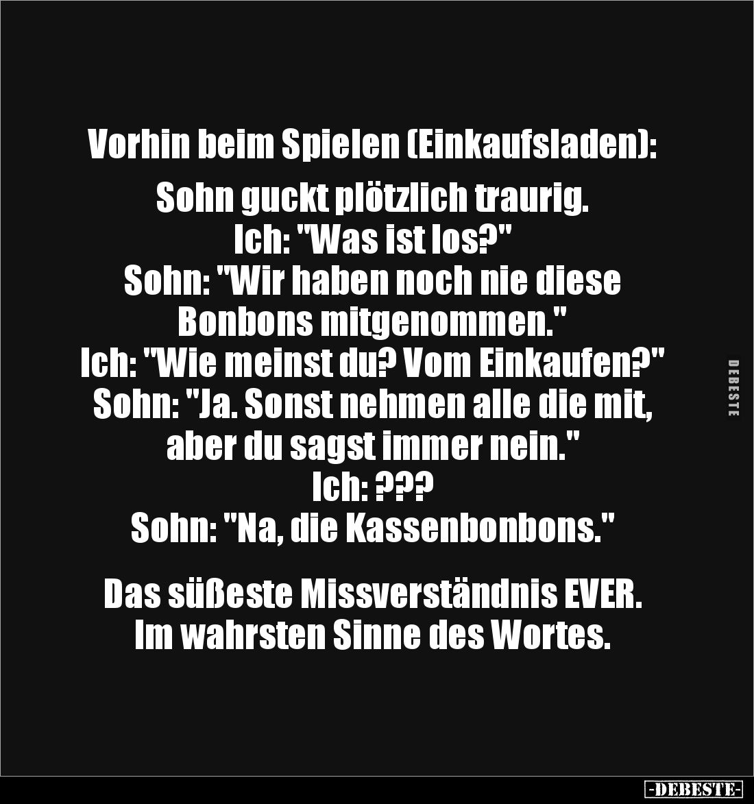 Vorhin beim Spielen (Einkaufsladen): Sohn guckt plötzlich traurig. Ich: "Was ist los?" Sohn: "Wir haben noch nie diese Bonbons mitgenommen." Ich: "Wie meinst du? Vom Einkaufen?" Sohn: "Ja. Sonst nehmen alle die mit, aber du sagst immer nein." Ich: ??? Sohn: "Na, die Kassenbonbons." Das süßeste Missverständnis EVER. Im wahrsten Sinne des Wortes.