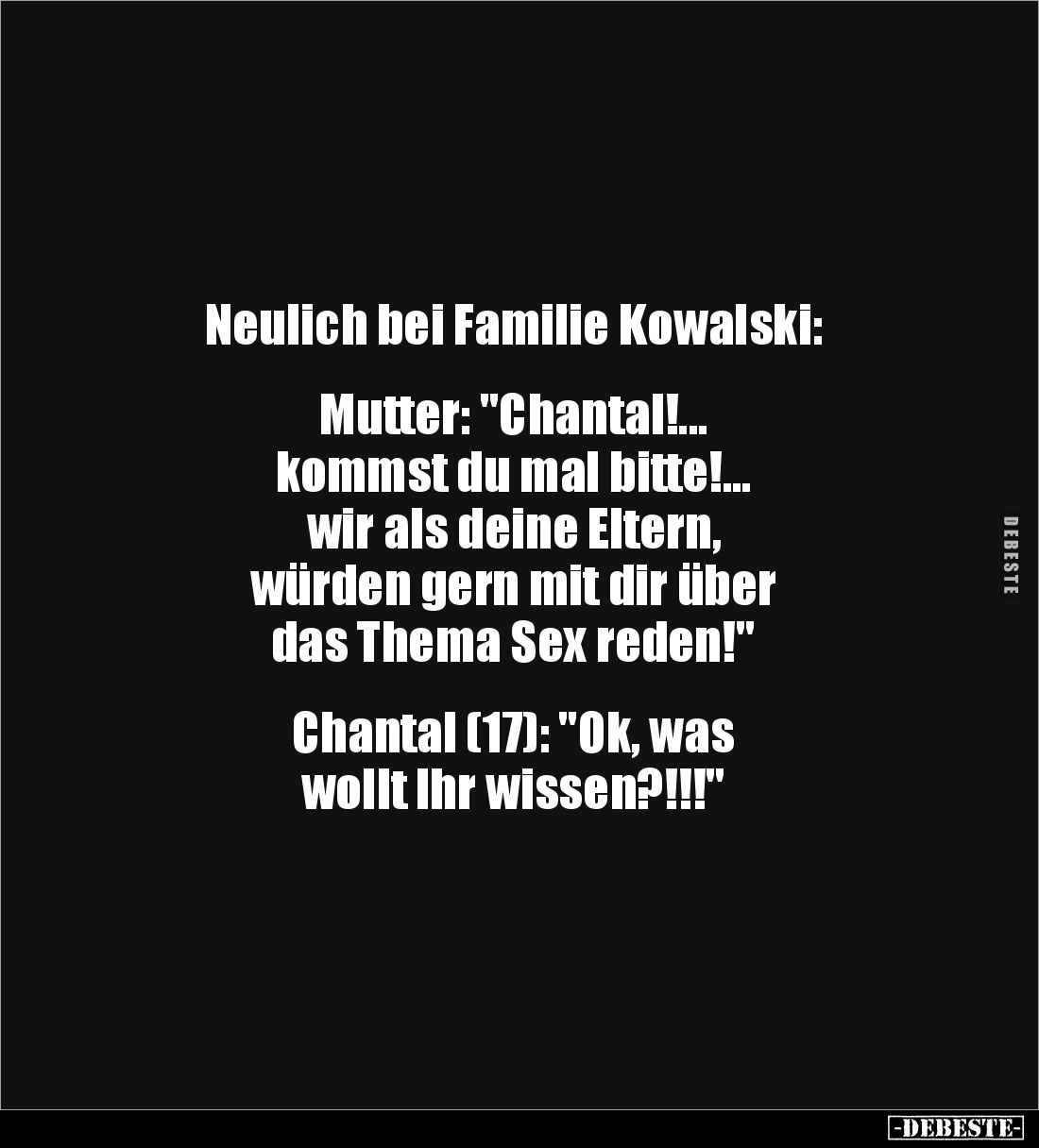 Neulich bei Familie Kowalski: Mutter: "Chantal!... kommst du mal bitte!... wir als deine Eltern, würden gern mit dir über das Thema Sex reden!" Chantal (17): "Ok, was wollt Ihr wissen?!!!"