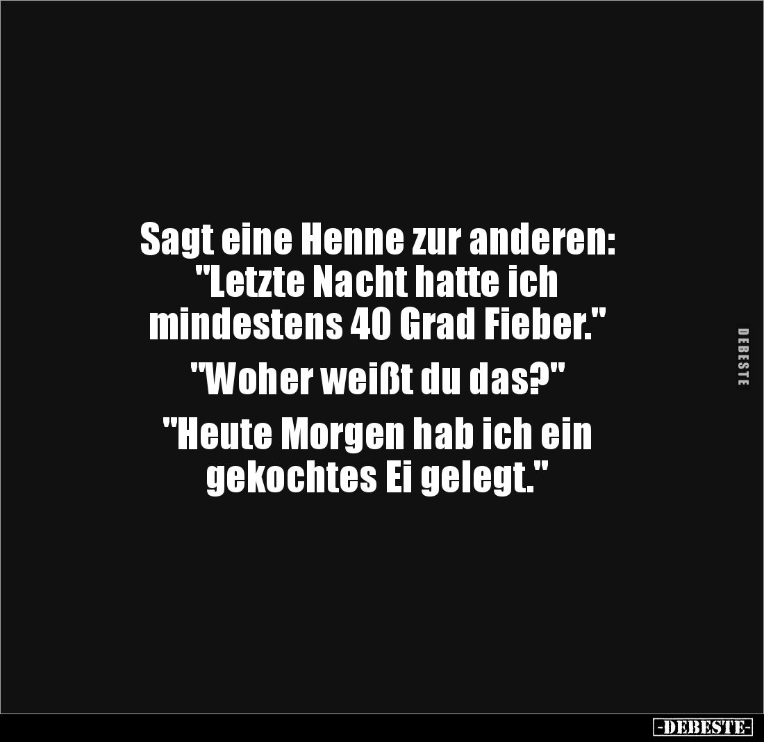 Sagt eine Henne zur anderen: "Letzte Nacht hatte ich mindestens 40 Grad Fieber." "Woher weißt du das?" "Heute Morgen hab ich ein gekochtes Ei gelegt."