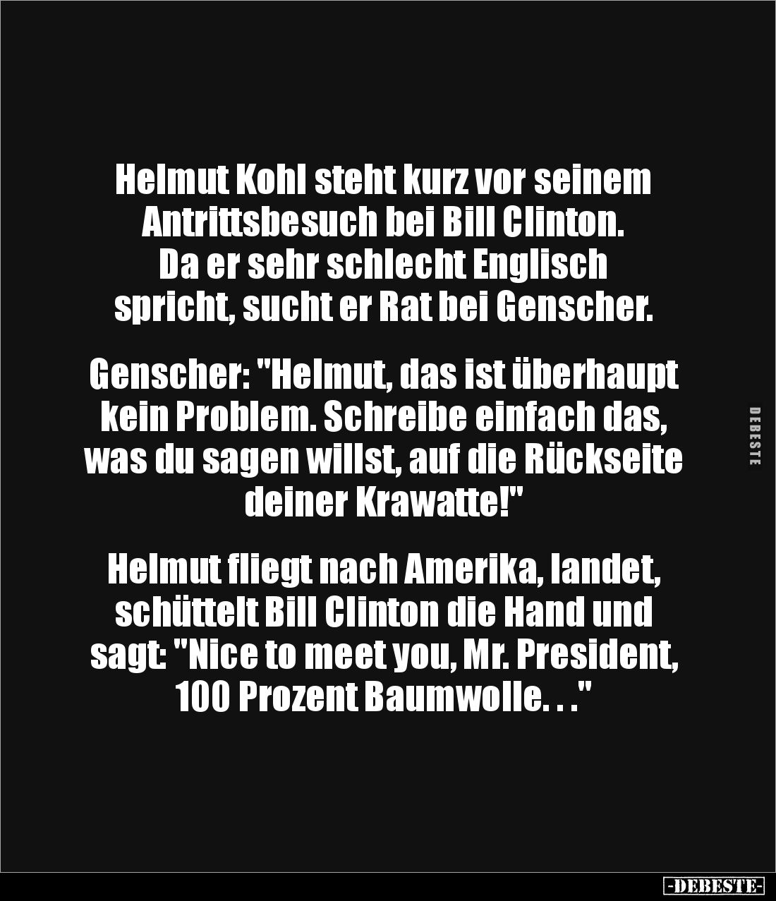 Helmut Kohl steht kurz vor seinem Antrittsbesuch bei Bill Clinton. Da er sehr schlecht Englisch spricht, sucht er Rat bei Genscher. Genscher: "Helmut, das ist überhaupt kein Problem. Schreibe einfach das, was du sagen willst, auf die Rückseite deiner Krawatte!" Helmut fliegt nach Amerika, landet, schüttelt Bill Clinton die Hand und sagt: "Nice to meet you, Mr. President, 100 Prozent Baumwolle. . ."