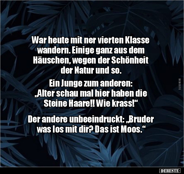 War heute mit ner vierten Klasse wandern. Einige ganz aus dem Häuschen, wegen der Schönheit der Natur und so. Ein Junge zum anderen: „Alter schau mal hier haben die Steine Haare!! Wie krass!“ Der andere unbeeindruckt: „Bruder was los mit dir? Das ist Moos.“