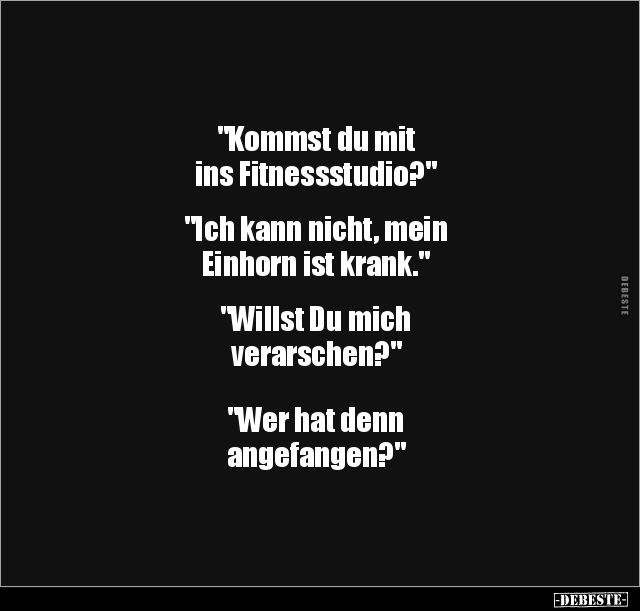 "Kommst du mit ins Fitnessstudio?" "Ich kann nicht, mein Einhorn ist krank." "Willst Du mich verarschen?" "Wer hat denn angefangen?"