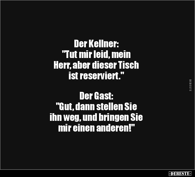 Der Kellner: "Tut mir leid, mein Herr, aber dieser Tisch ist reserviert." Der Gast: "Gut, dann stellen Sie ihn weg, und bringen Sie mir einen anderen!"