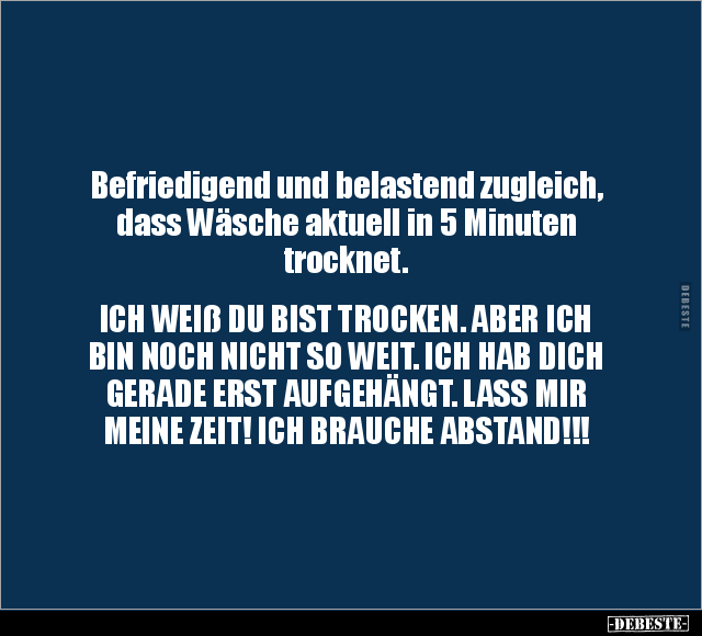 Befriedigend und belastend zugleich, dass Wäsche aktuell in 5 Minuten trocknet. ICH WEIß DU BIST TROCKEN. ABER ICH BIN NOCH NICHT SO WEIT. ICH HAB DICH GERADE ERST AUFGEHÄNGT. LASS MIR MEINE ZEIT! ICH BRAUCHE ABSTAND!!!