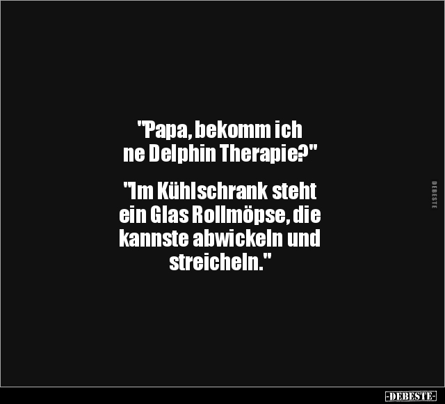 "Papa, bekomm ich ne Delphin Therapie?" "Im Kühlschrank steht ein Glas Rollmöpse, die kannste abwickeln und streicheln."
