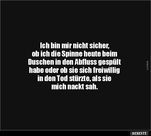 Ich bin mir nicht sicher, ob ich die Spinne heute beim Duschen in den Abfluss gespült habe oder ob sie sich freiwillig in den Tod stürzte, als sie mich nackt sah.
