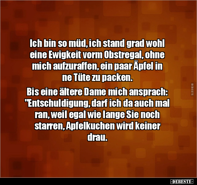 Ich bin so müd, ich stand grad wohl eine Ewigkeit vorm Obstregal, ohne mich aufzuraffen, ein paar Äpfel in ne Tüte zu packen. Bis eine ältere Dame mich ansprach: "Entschuldigung, darf ich da auch mal ran, weil egal wie lange Sie noch starren, Apfelkuchen wird keiner drau.