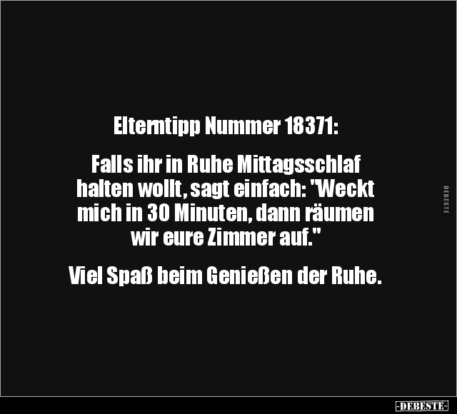 Elterntipp Nummer 18371: Falls ihr in Ruhe Mittagsschlaf halten wollt, sagt einfach: "Weckt mich in 30 Minuten, dann räumen wir eure Zimmer auf." Viel Spaß beim Genießen der Ruhe.
