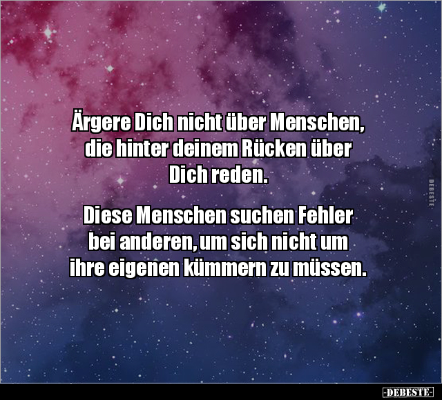 Ärgere Dich nicht über Menschen, die hinter deinem Rücken über Dich reden. Diese Menschen suchen Fehler bei anderen, um sich nicht um ihre eigenen kümmern zu müssen.