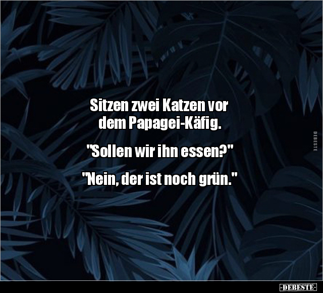 Sitzen zwei Katzen vor dem Papagei-Käfig. "Sollen wir ihn essen?" "Nein, der ist noch grün."