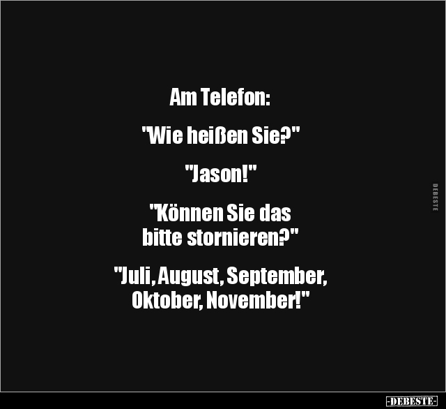 Am Telefon: "Wie heißen Sie?" "Jason!" "Können Sie das bitte stornieren?" "Juli, August, September, Oktober, November!"