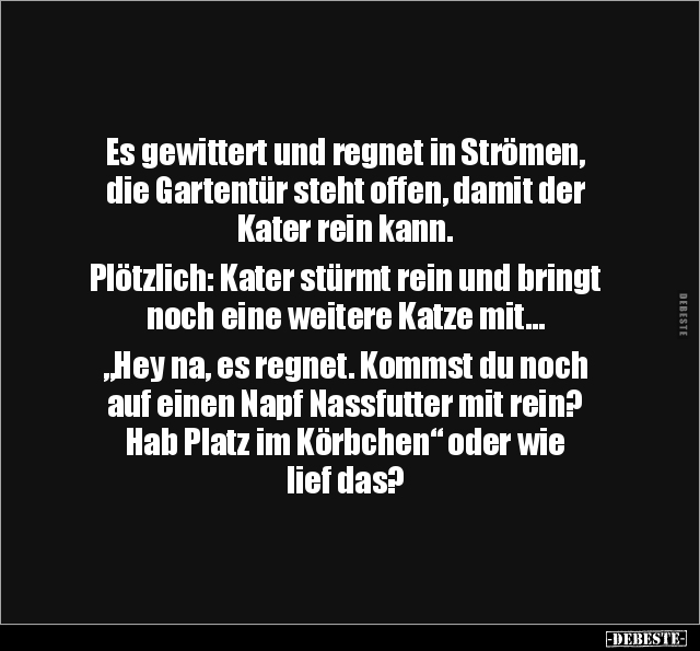 Es gewittert und regnet in Strömen, die Gartentür steht offen, damit der Kater rein kann. Plötzlich: Kater stürmt rein und bringt noch eine weitere Katze mit... „Hey na, es regnet. Kommst du noch auf einen Napf Nassfutter mit rein? Hab Platz im Körbchen“ oder wie lief das?
