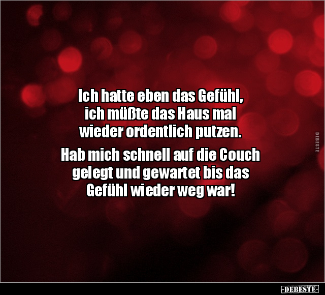 Ich hatte eben das Gefühl, ich müßte das Haus mal wieder ordentlich putzen. Hab mich schnell auf die Couch gelegt und gewartet bis das Gefühl wieder weg war!