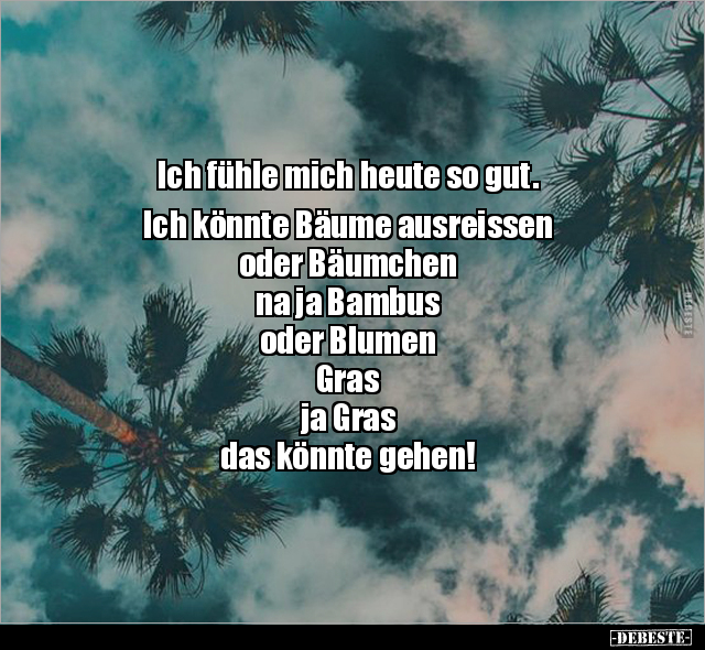 Ich fühle mich heute so gut. Ich könnte Bäume ausreissen oder Bäumchen na ja Bambus oder Blumen Gras ja Gras das könnte gehen!