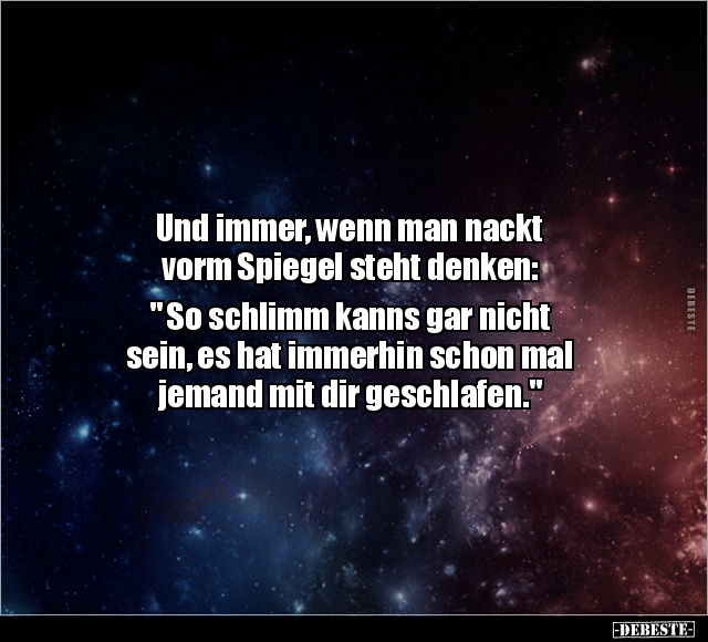 Und immer, wenn man nackt vorm Spiegel steht denken: " So schlimm kanns gar nicht sein, es hat immerhin schon mal jemand mit dir geschlafen."