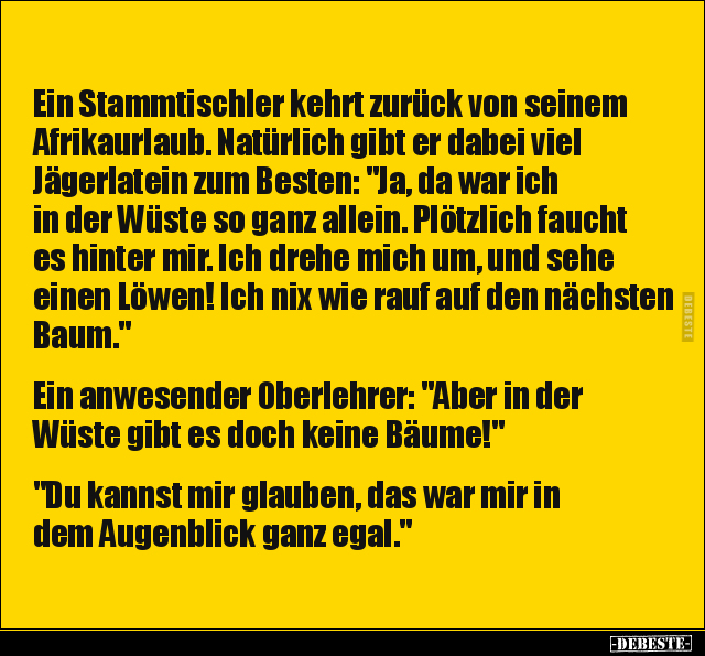 Ein Stammtischler kehrt zurück von seinem Afrikaurlaub. Natürlich gibt er dabei viel Jägerlatein zum Besten: "Ja, da war ich in der Wüste so ganz allein. Plötzlich faucht es hinter mir. Ich drehe mich um, und sehe einen Löwen! Ich nix wie rauf auf den nächsten Baum." Ein anwesender Oberlehrer: "Aber in der Wüste gibt es doch keine Bäume!" "Du kannst mir glauben, das war mir in dem Augenblick ganz egal."