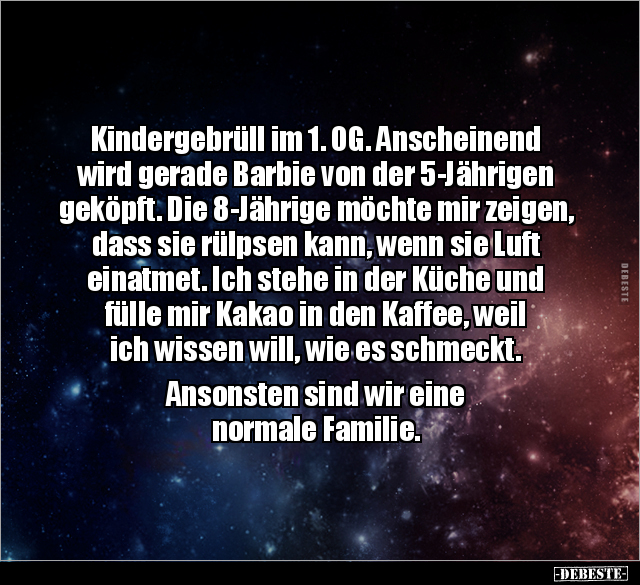Kindergebrüll im 1. OG. Anscheinend wird gerade Barbie von der 5-Jährigen geköpft. Die 8-Jährige möchte mir zeigen, dass sie rülpsen kann, wenn sie Luft einatmet. Ich stehe in der Küche und fülle mir Kakao in den Kaffee, weil ich wissen will, wie es schmeckt. Ansonsten sind wir eine normale Familie.
