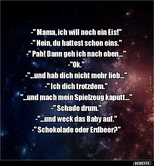 -" Mama, ich will noch ein Eis!" -" Nein, du hattest schon eins." -" Pah! Dann geh ich nach oben..." -"Ok." -"...und hab dich nicht mehr lieb..." -" Ich dich trotzdem." "...und mach mein Spielzeug kaputt..." -" Schade drum." -"...und weck das Baby auf." -" Schokolade oder Erdbeer?"