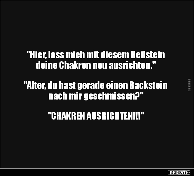 "Hier, lass mich mit diesem Heilstein deine Chakren neu ausrichten." "Alter, du hast gerade einen Backstein nach mir geschmissen?" "CHAKREN AUSRICHTEN!!!"