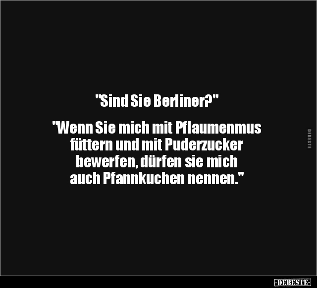 "Sind Sie Berliner?" "Wenn Sie mich mit Pflaumenmus füttern und mit Puderzucker bewerfen, dürfen sie mich auch Pfannkuchen nennen."